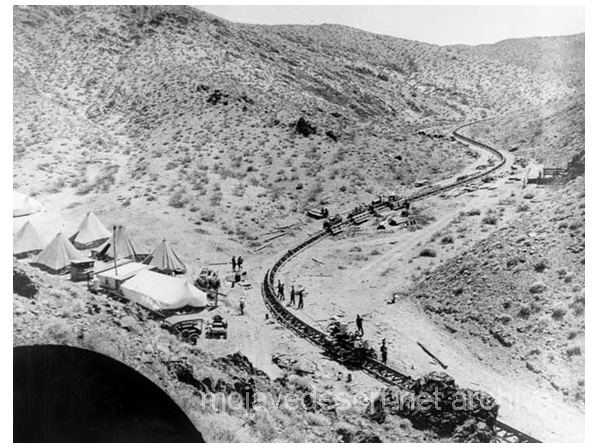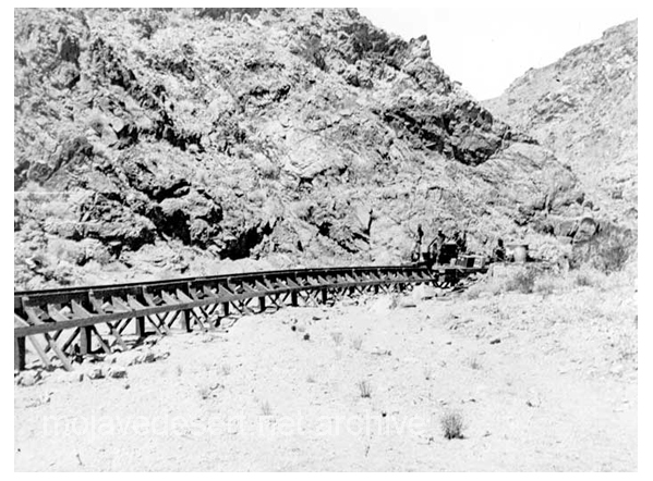 By the summer of 1925 mining operations began to suffer. The Wilmington plant was receiving ore containing 50 percent waste rock and the monorail was suffering from track warpage, cloudbursts and poor locomotive design. In June, 1926, the mine shut down. The monorail stood intact for approximately 10 years. In the 1930s the single rail and timbers were pulled up for scrap. The Naval Weapons Center, Mojave Range B now completely surrounds this deposit and most of the monorail line.